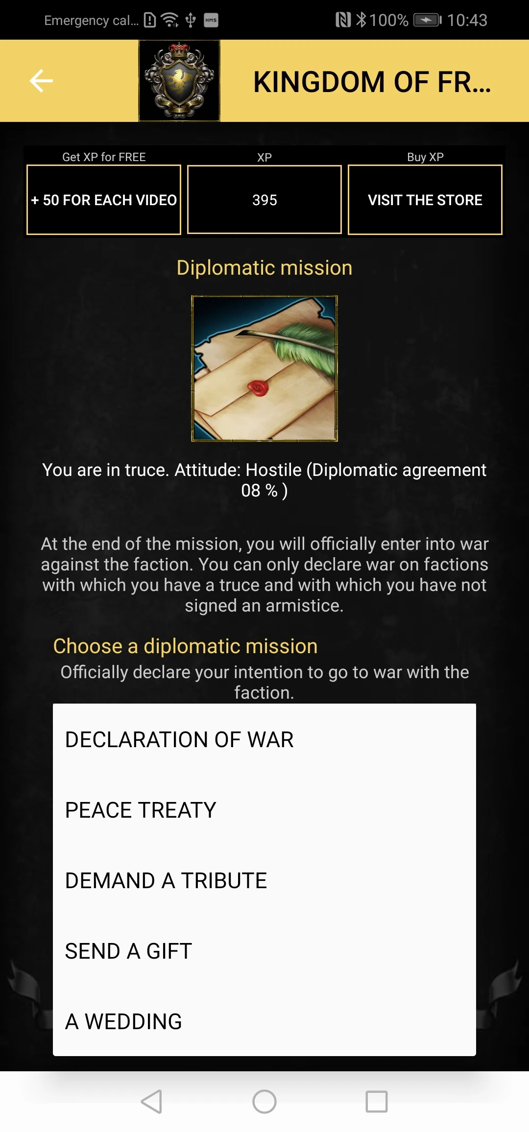 diplomatic missions allow you to manage your relationship with each faction. The missions available depend on your current diplomatic status. During a truce one can declare war, demand a tribute, offer a gift or, propose a peace treaty. During the peace you will be able to make agreements that are advantageous to both parties and arrange royal weddings between your family and the faction's family. Finally, during a war you will be able to discuss how to bring hostilities to an end.