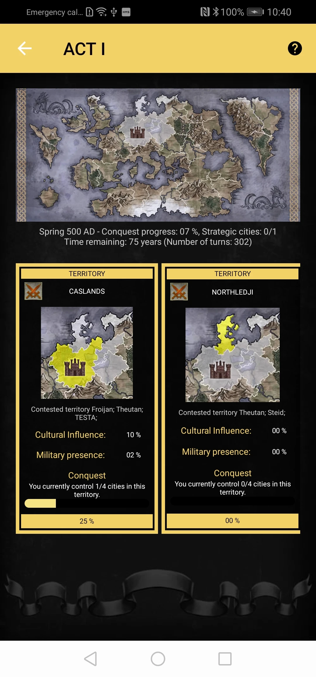 The game is divided into acts. In each act, you will have the principal objective of conquering and controlling a certain number of cities before the act comes to an end, and a secondary objective to conquer all the territories. To do this, you'll need to manage your cities, your armies, and your relationships with other factions as well as you can.