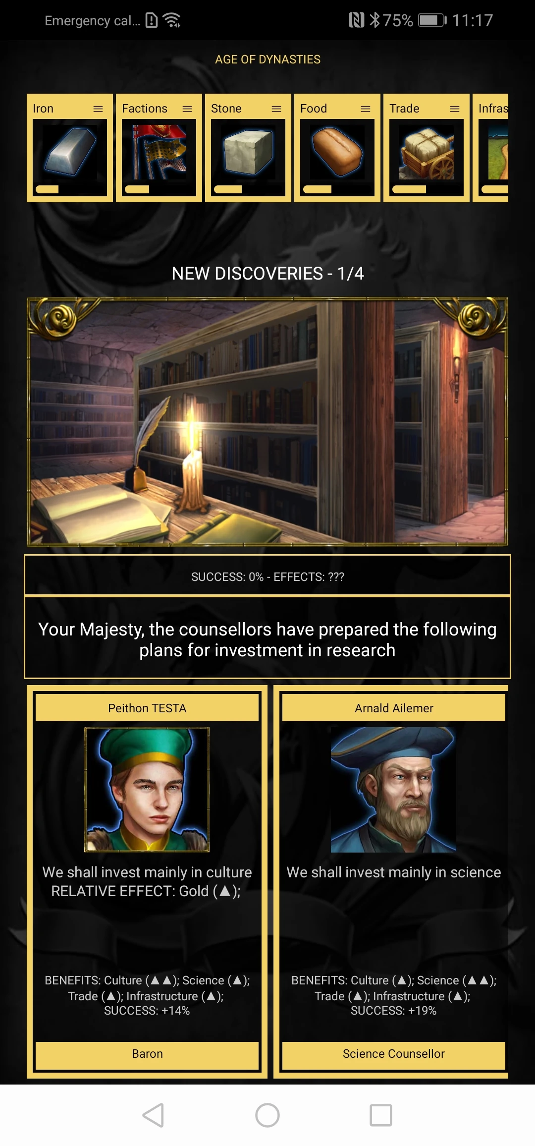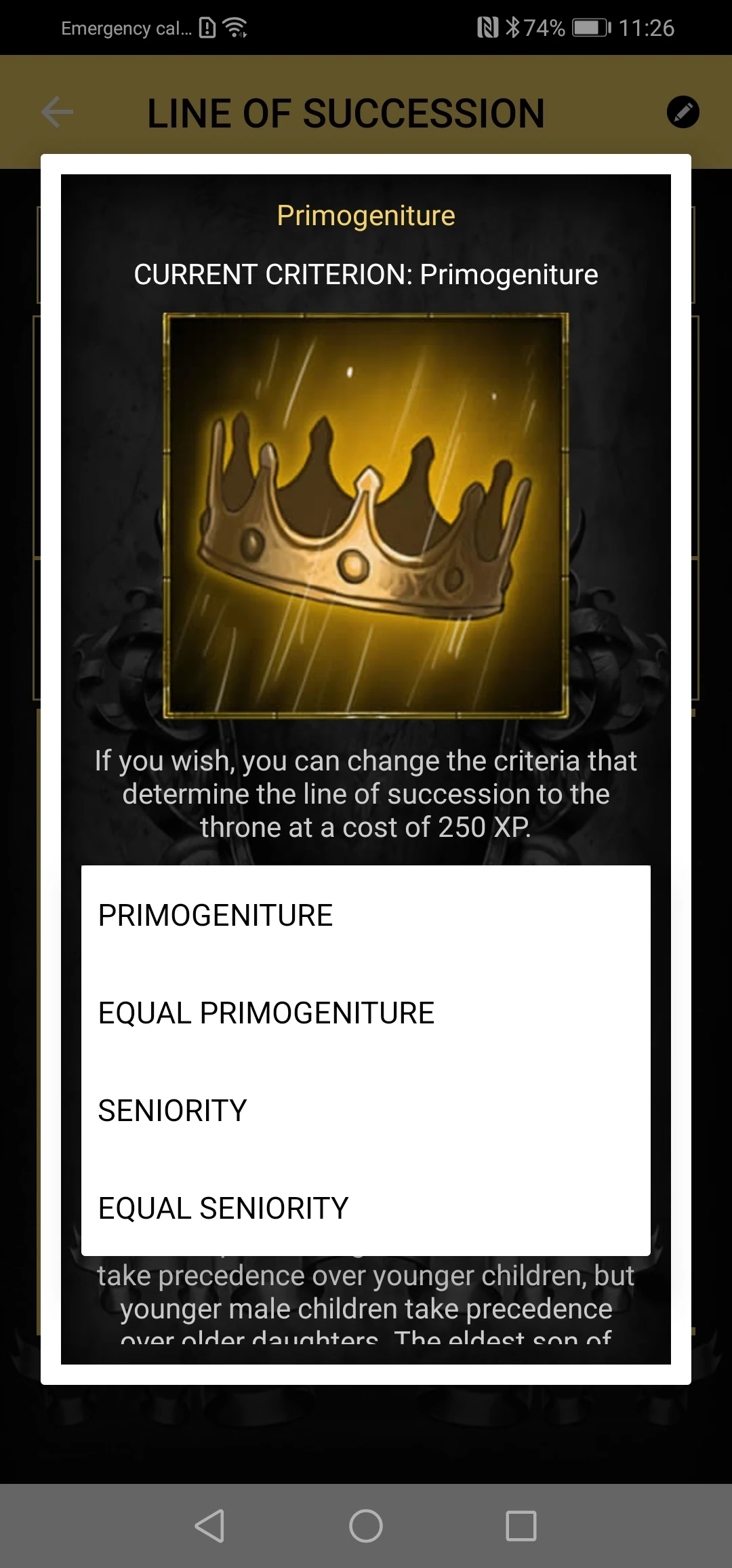 This view shows the relatives who can participate in the succession to the throne starting from the legitimate successor to the throne up to the farthest one. By touching a character's card, you can change the name and image. You can educate your heirs to improve the likelihood that when they sit on the throne they will have positive traits.