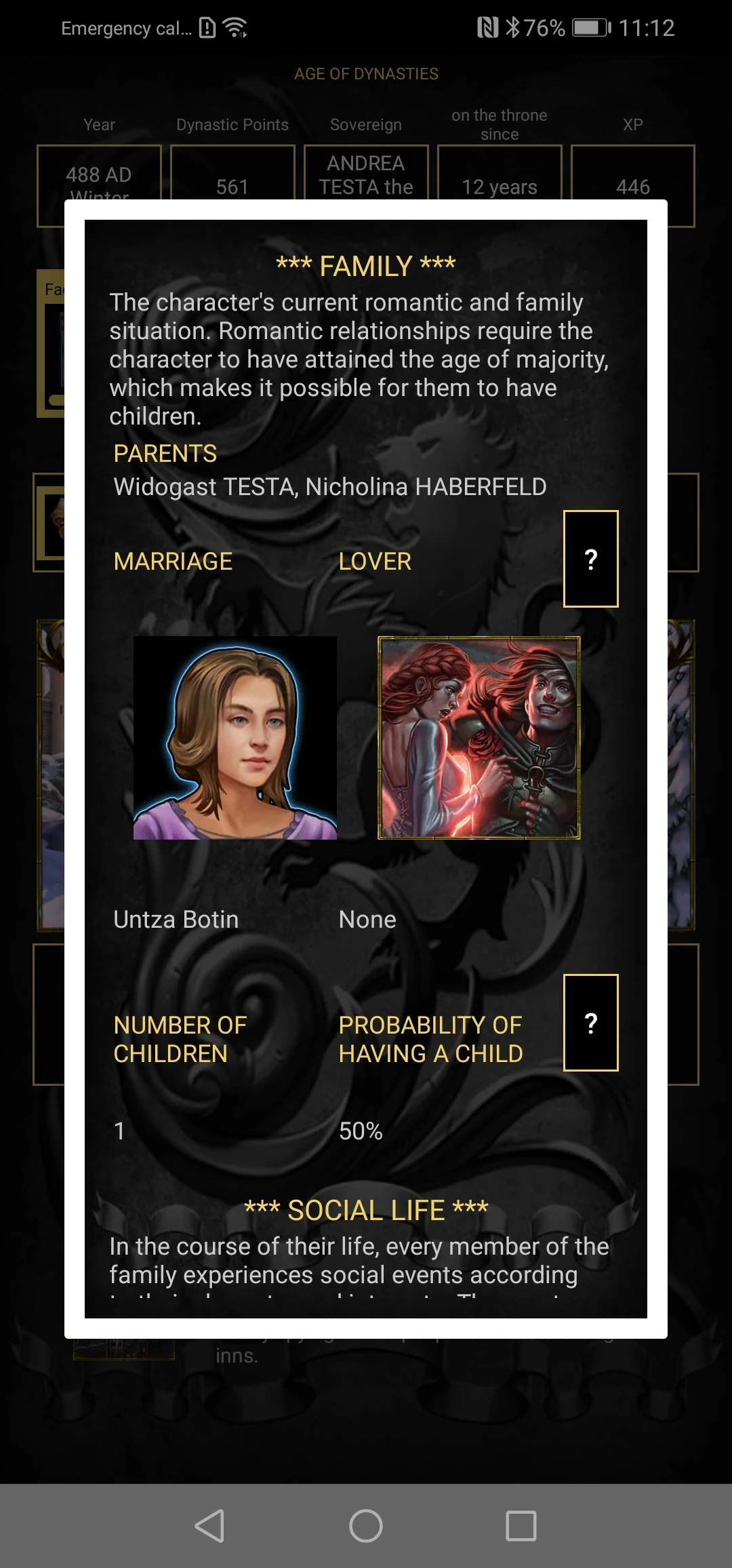 When a character reaches the age of majority, they can enter into romantic relationships. Celebrating a wedding creates a 50% chance that the character will have a child. A relationship with a lover increase the probability of them having a child by 40%. When a character is over 50 years old, the odds are halved. The likelihood of the sovereign having children increased by 30%.