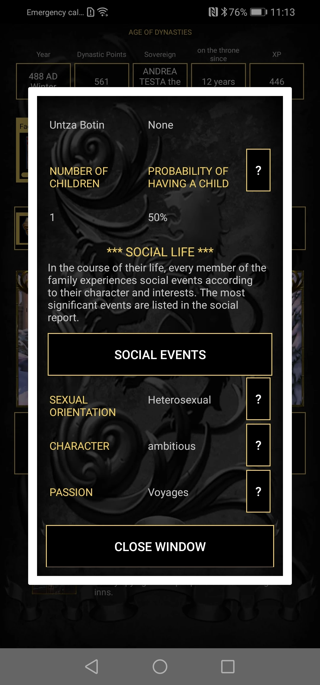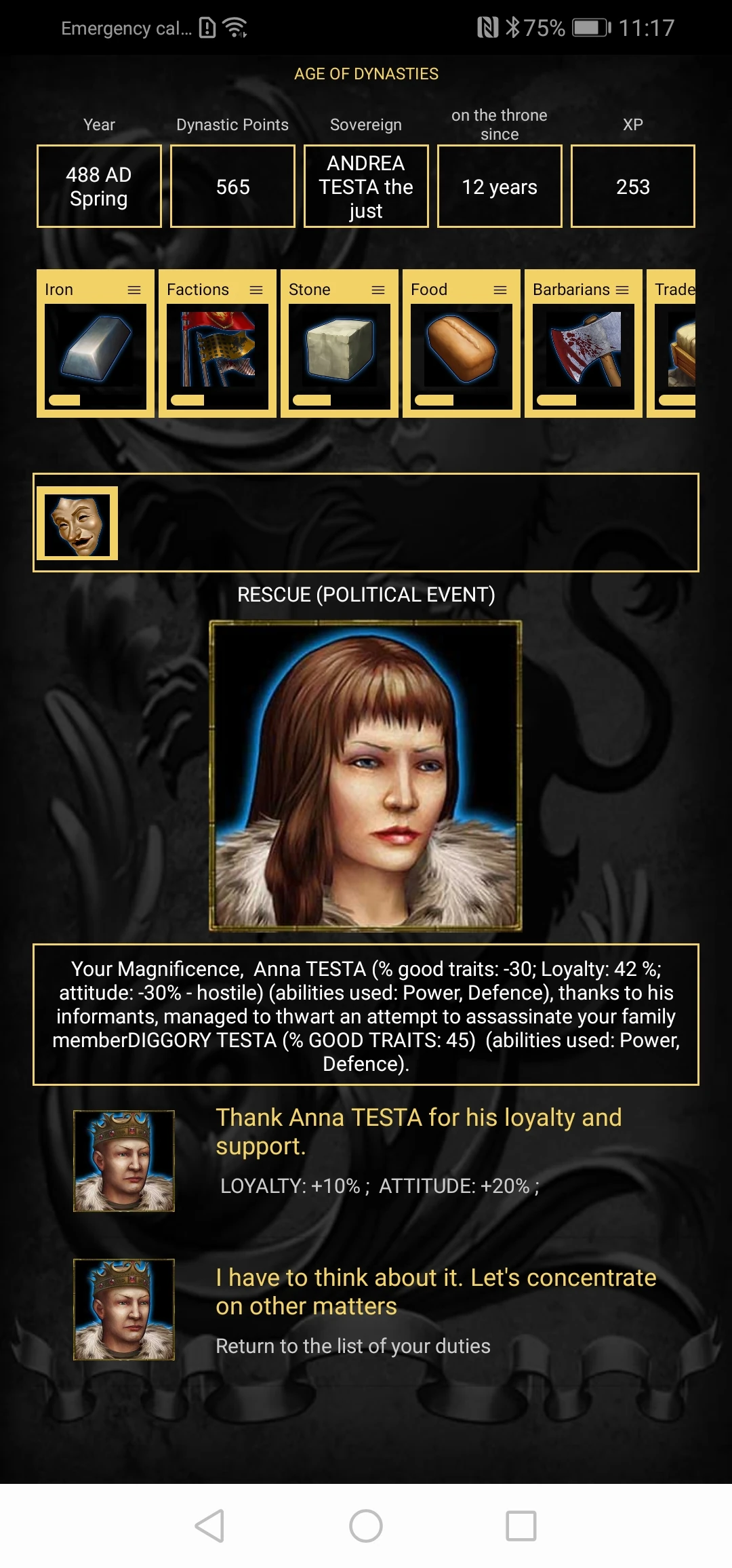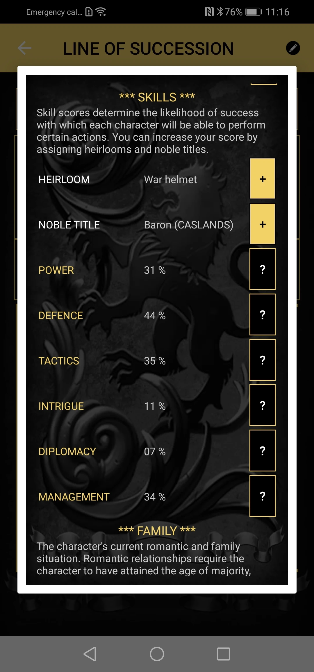 In the upper part it is possible to view the personal information, the loyalty of the relative towards the dynasty, the attitude of the relative towards the current sovereign, his/her right to access the throne and the percentage that has positive traits if he/she were chosen to become the new sovereign.