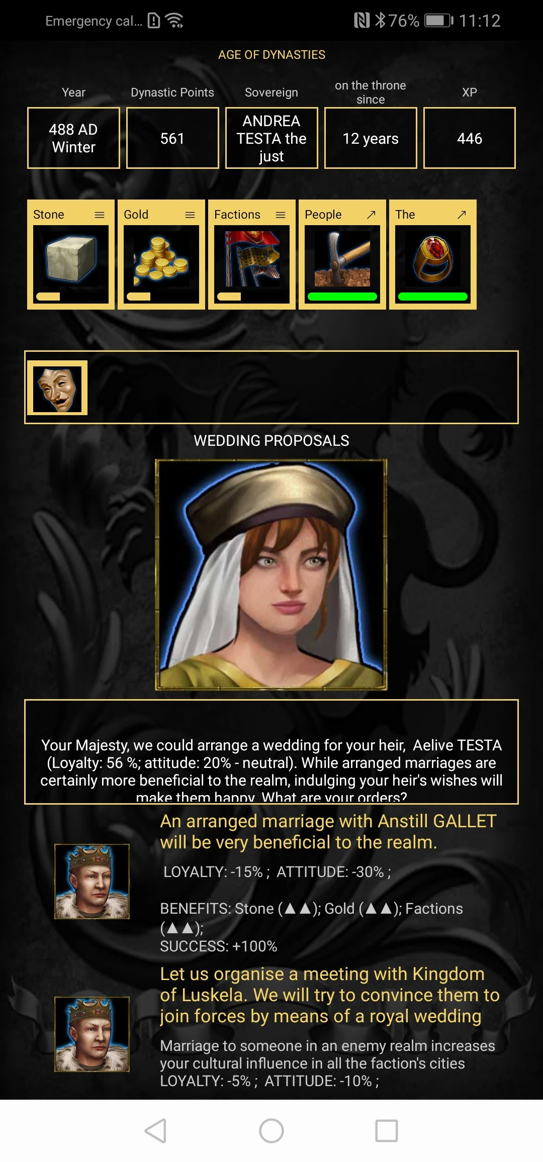 - a marriage to be proposed to a faction of the game (the relative will not be enthusiastic about it but you will have the possibility to increase the cultural influence in all the cities of the faction if he agrees to unite your houses in a marriage)